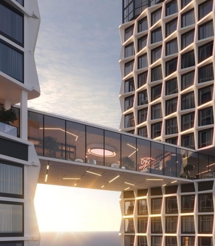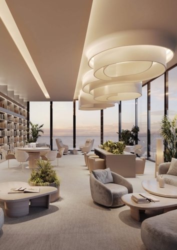 На уровне 9 этажа башни соединены клубным пространством с панорамным видом на залив. Место для встреч, отдыха и времени для себя.