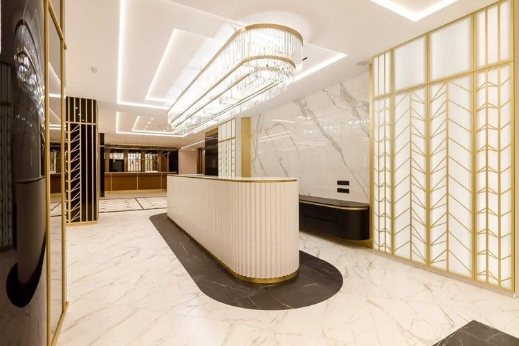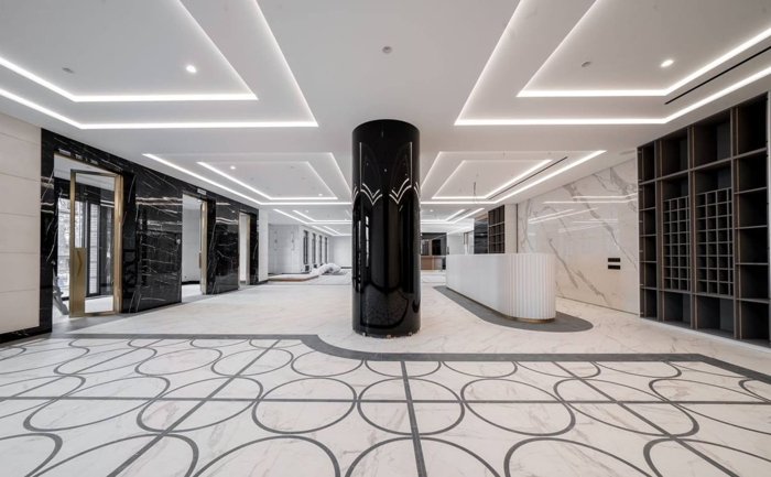 Лобби выполнено с использованием итальянского мрамора и ценных пород дерева. Здесь приятно встречаться с гостями или проводить деловые встречи, не выходя из дома.