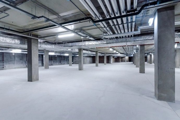 Двор полностью свободен от машин. Спуск в паркинг — на лифте, с удобным радиусом разворота и видеонаблюдением.