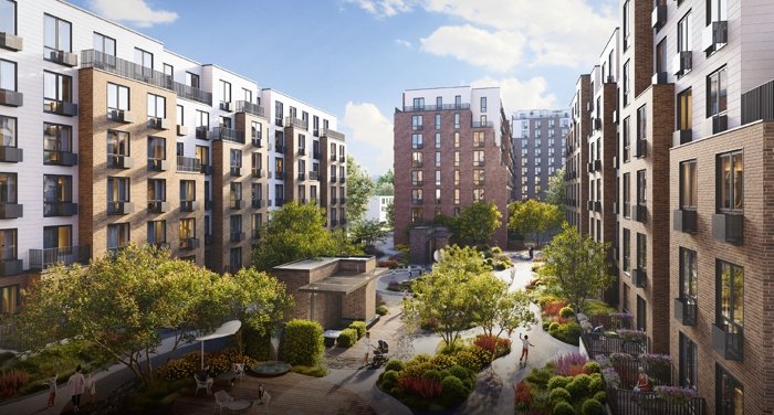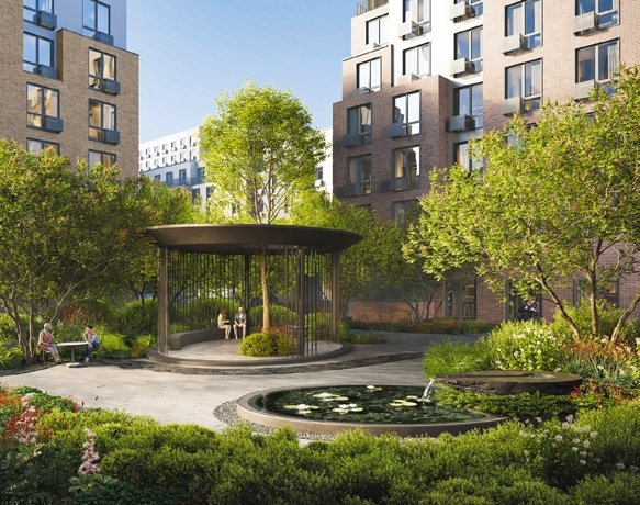 Дворы оформлены как единый ландшафтный парк с водными элементами, зеленью и зонами отдыха. Пространство живое и продуманное, а не формальное.