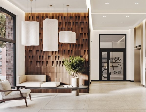 Панорамное остекление, высокие потолки, дизайнерская отделка. Парадная выглядит как лобби современного жилого дома.