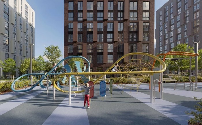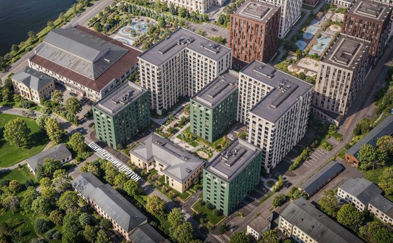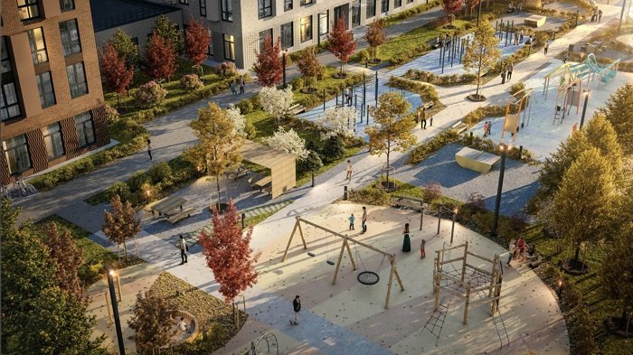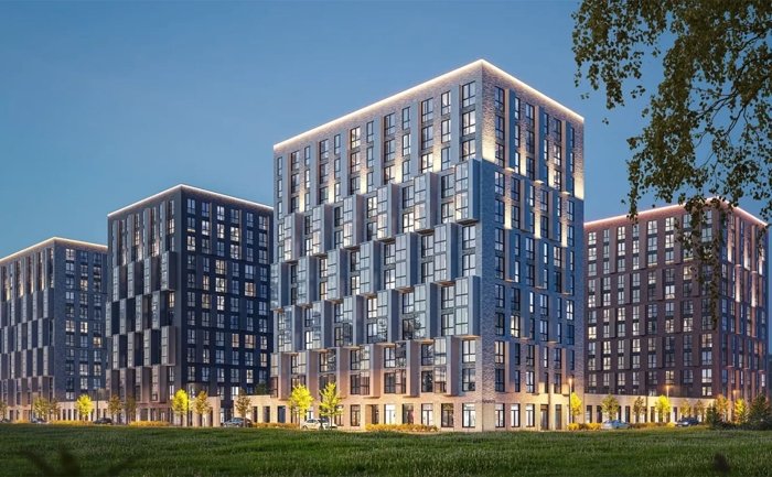 Проект включает квартиры от студий до 3+ комнат с кухнями-гостиными, панорамными окнами и террасами. Закрытые дворы-парки без машин, гранд-лобби с детской комнатой, подземный паркинг и кладовые на нижнем уровне.