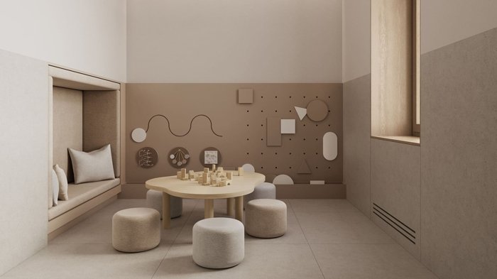 Лобби в стиле джапанди с зоной ожидания, детской комнатой и колясочной.
