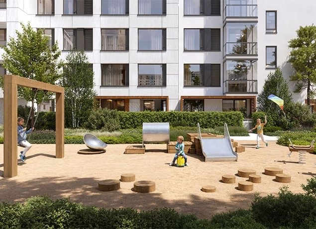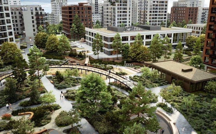 Внутри комплекса предусмотрены школа и детский сад в центральной части квартала.