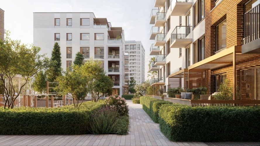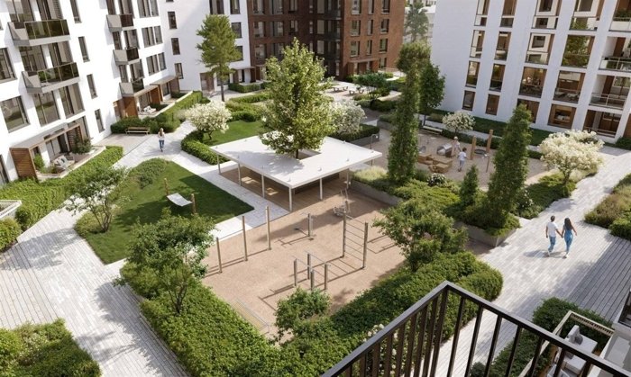 Внутренний зелёный контур и парк. Дворы подняты над уровнем улицы, создавая приватную среду.