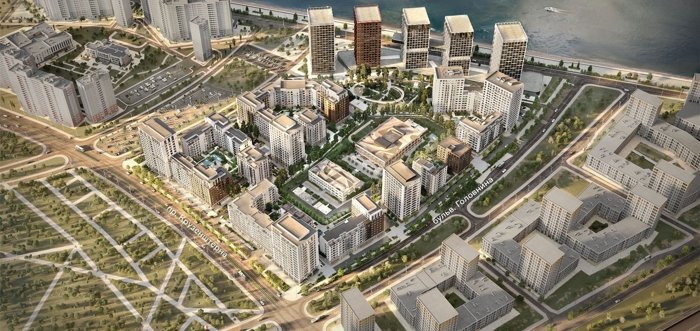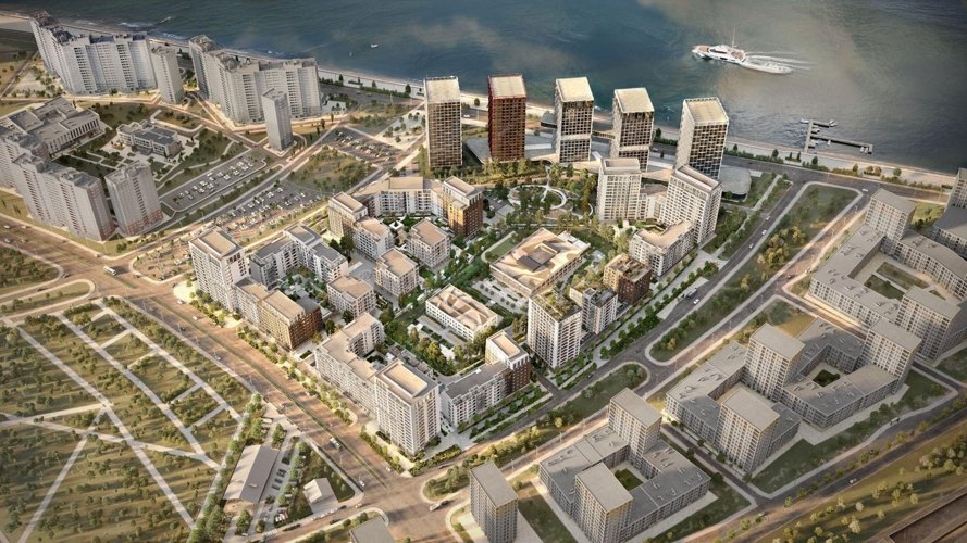 Квартал бизнес-класса у Финского залива с парком и урбан-виллами. Намыв Васильевского острова, террасы, таунхаусы, паркинг.